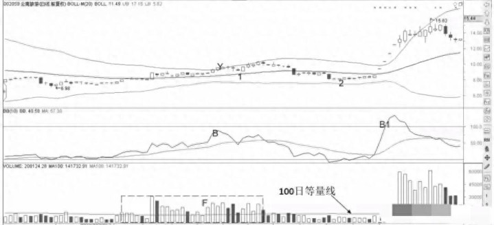股价经历长时间下跌调整以后,布林带开始由宽变窄,逐步收口,说明市场波动在减小,多空双方趋于平衡。此时股价如果能放量站上中轨,并且中轨开始由下行转为走平或微向上,这往往是主力建仓结束的信号。后市需要重点观察,股价回踩中轨时是否能获得支撑,如果能撑住,说明这个位置已经成为强支撑位。