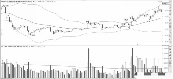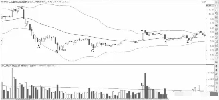 股价在震荡或下跌过程中,布林带突然开口向下,股价快速跌破下轨,成交量并没有明显放大,甚至出现缩量。这种走势很多人会恐慌割肉,但往往这是下跌末期的最后一杀。如果随后一两天股价能快速收回下轨上方,并且下轨开始走平,说明是主力的诱空洗盘动作。后市如果股价能站稳中轨,才能确认洗盘结束。