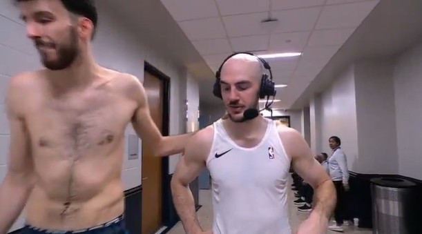 虽瘦但能抢板!卡鲁索赛后接受采访时切特经过半裸排骨吸引眼球